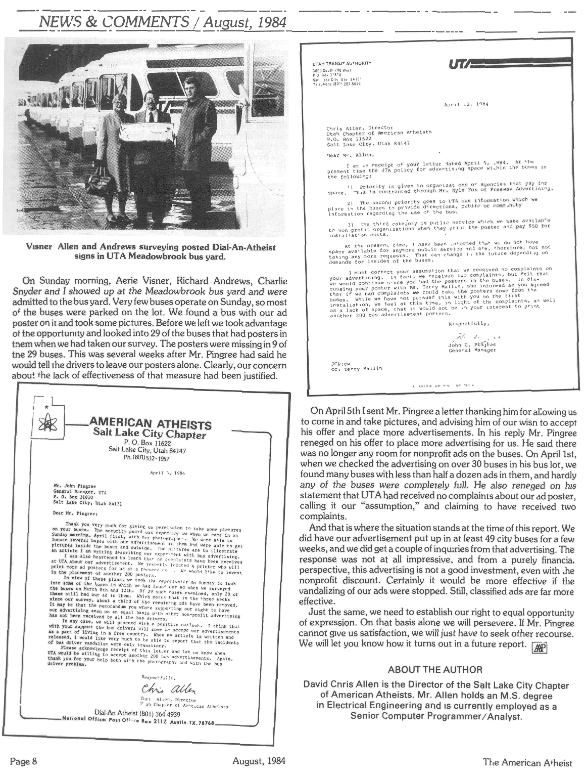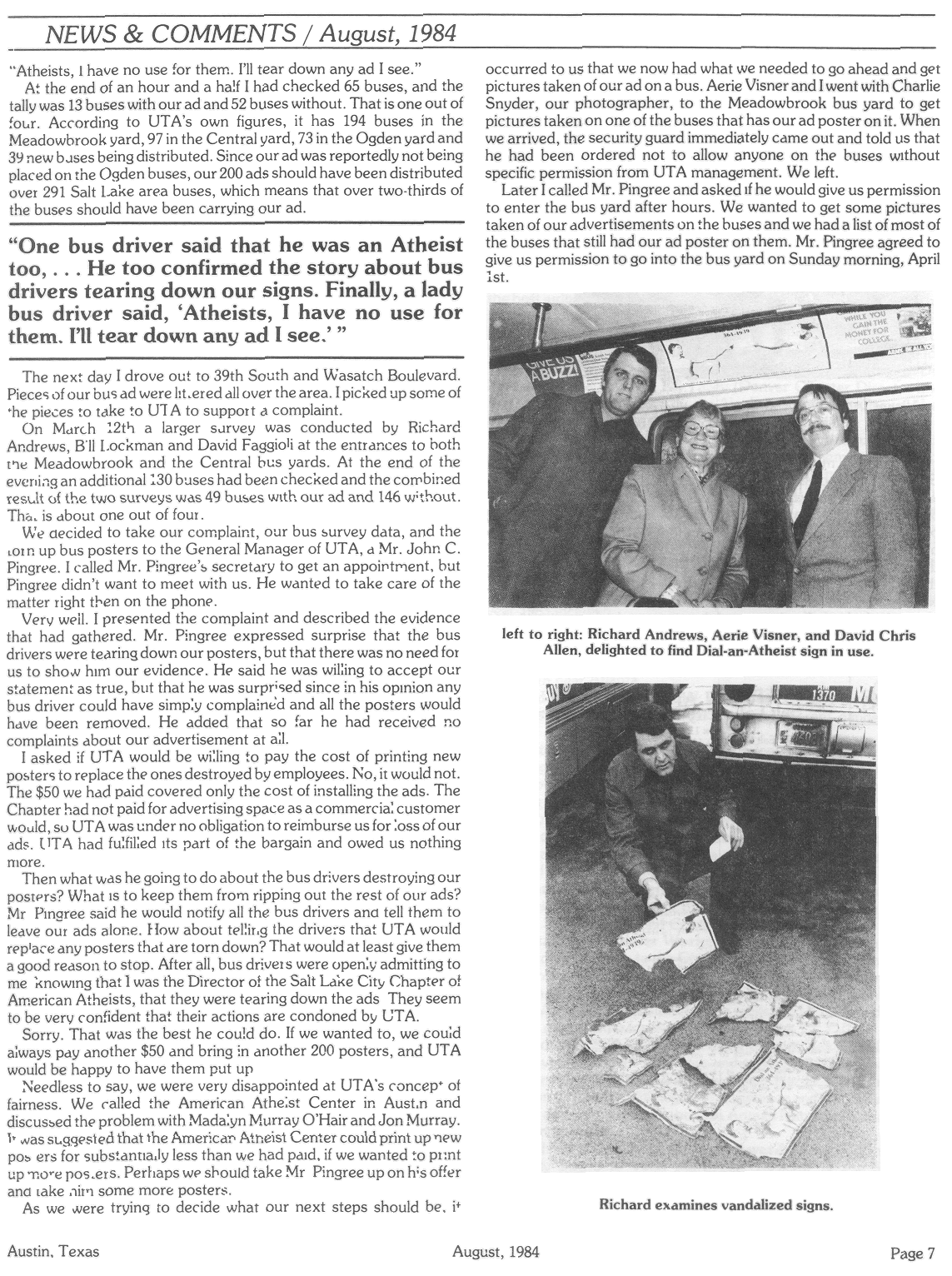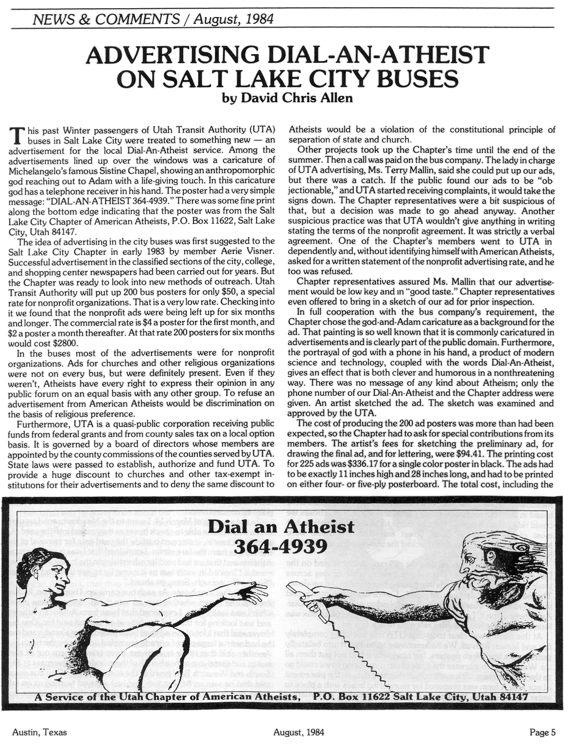 The story of Atheist Bus Signs in Salt Lake City Utah, as it appeared in 1984's American Atheist Magazine.