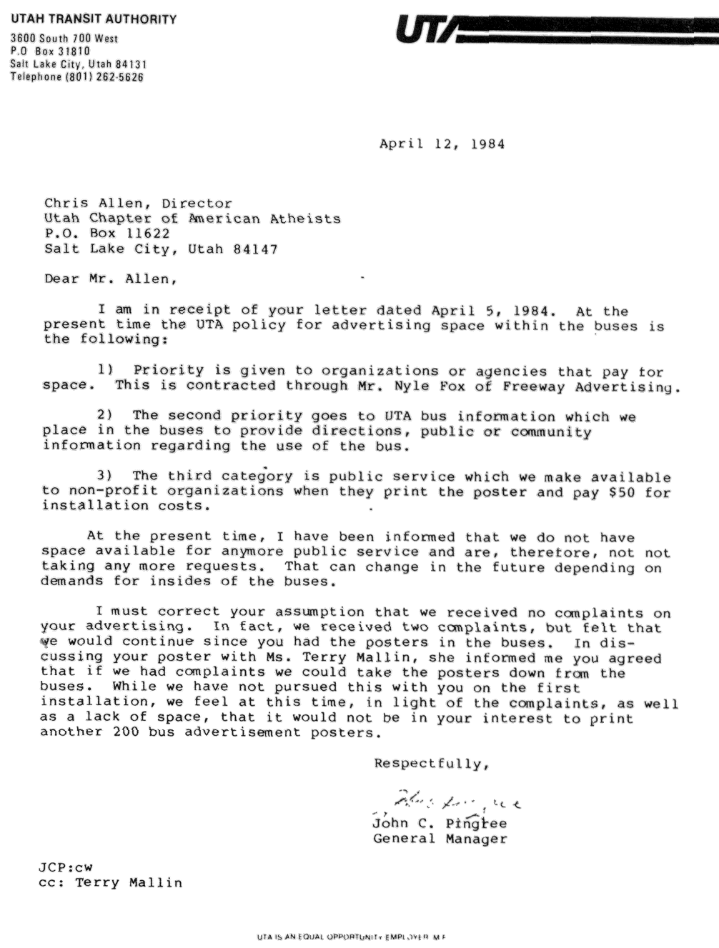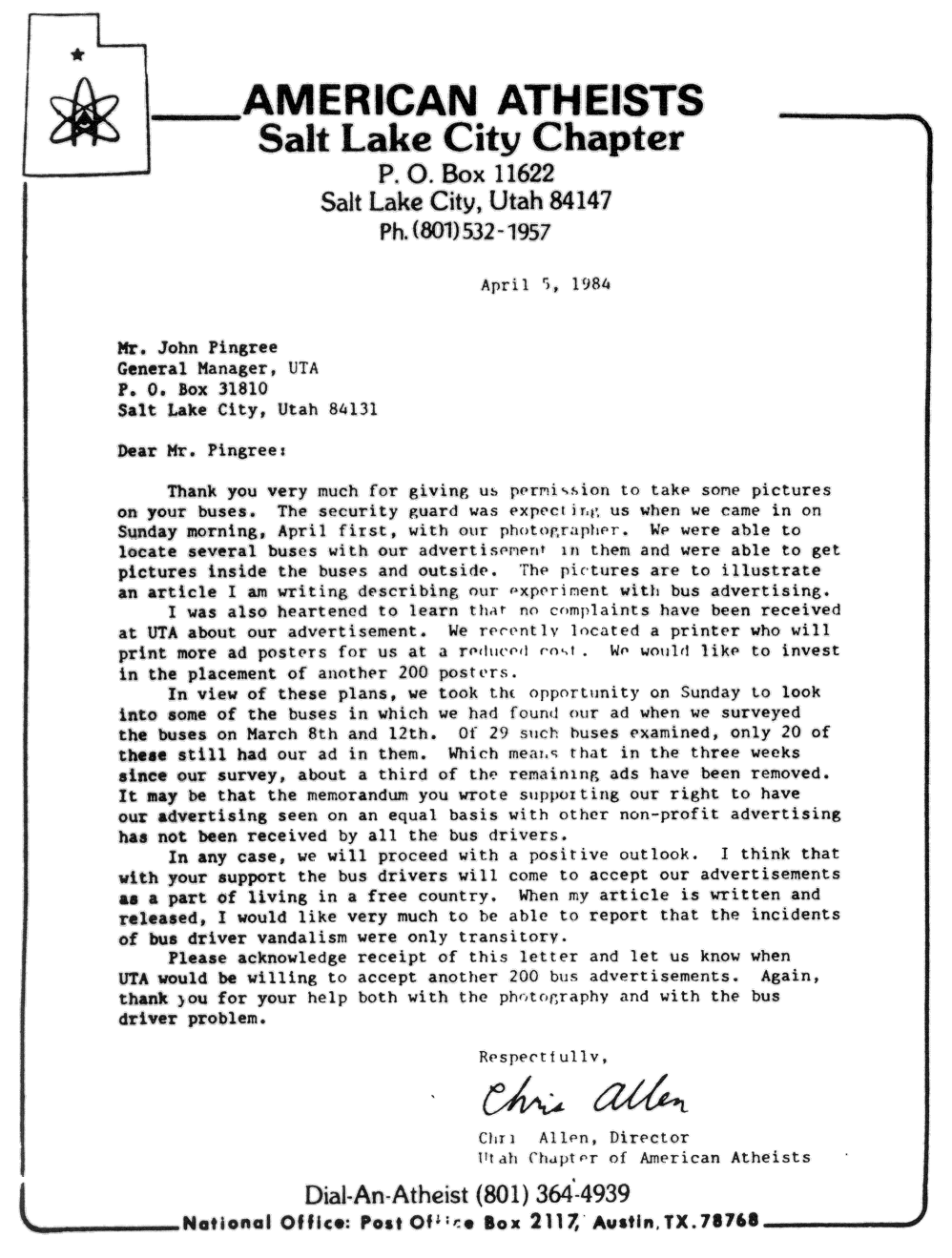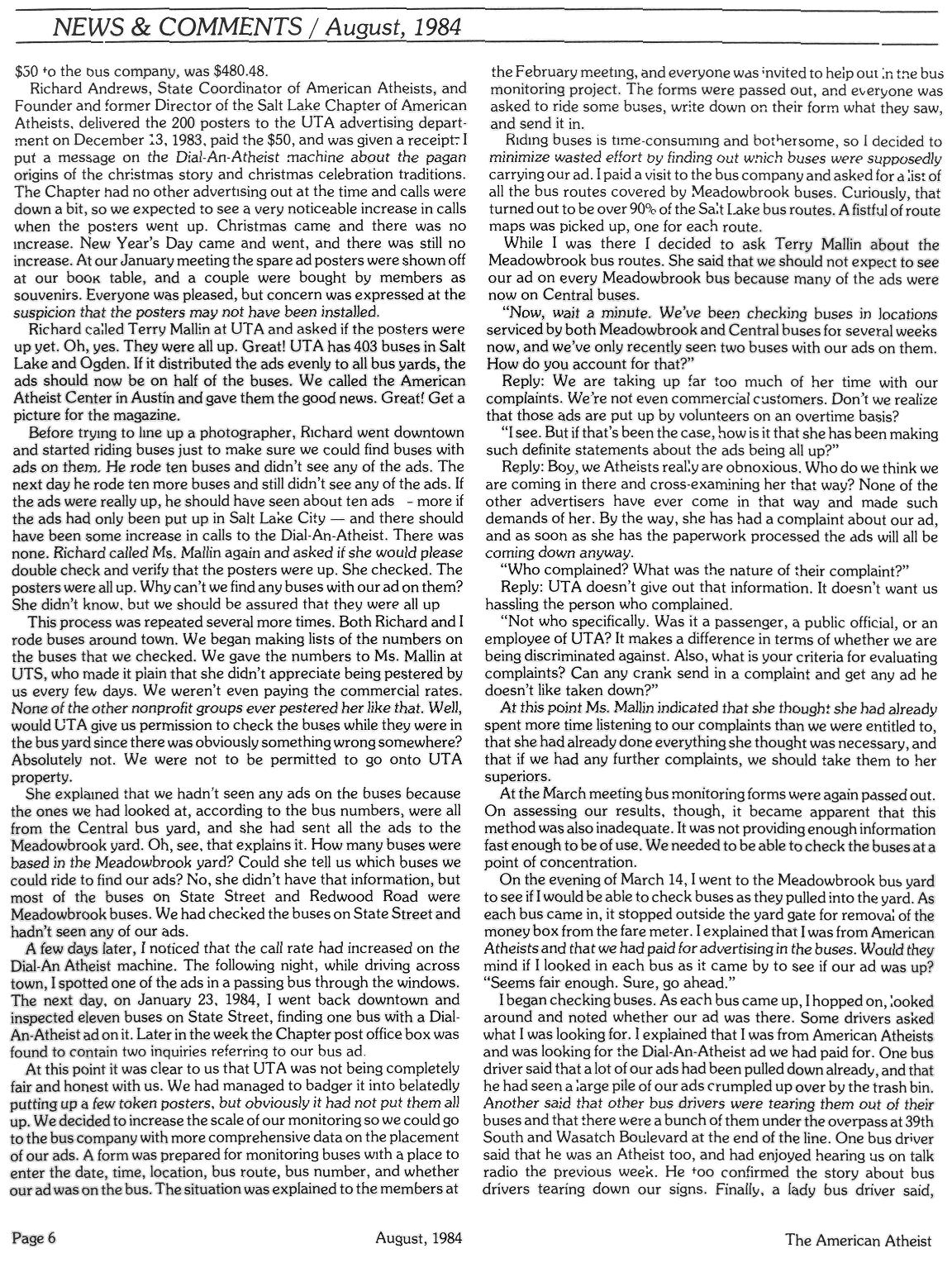 The story of Atheist Bus Signs in Salt Lake City Utah, as it appeared in 1984's American Atheist Magazine.