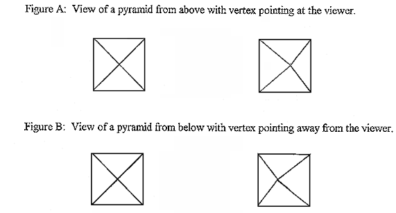 The opposite effect can be achieved by simply looking at each set when crossing the eyes. At a certain degree of crossing, three images can be seen and the middle image appears clearly to be a pyramid, however with the opposite effect of that with the stereoscope: In figure A the pyramid now points away from the viewer, and in figure B the pyramid points toward him. (This effect can be explained by the fact that the left eye receives the right image and the right eye sees the left image.)