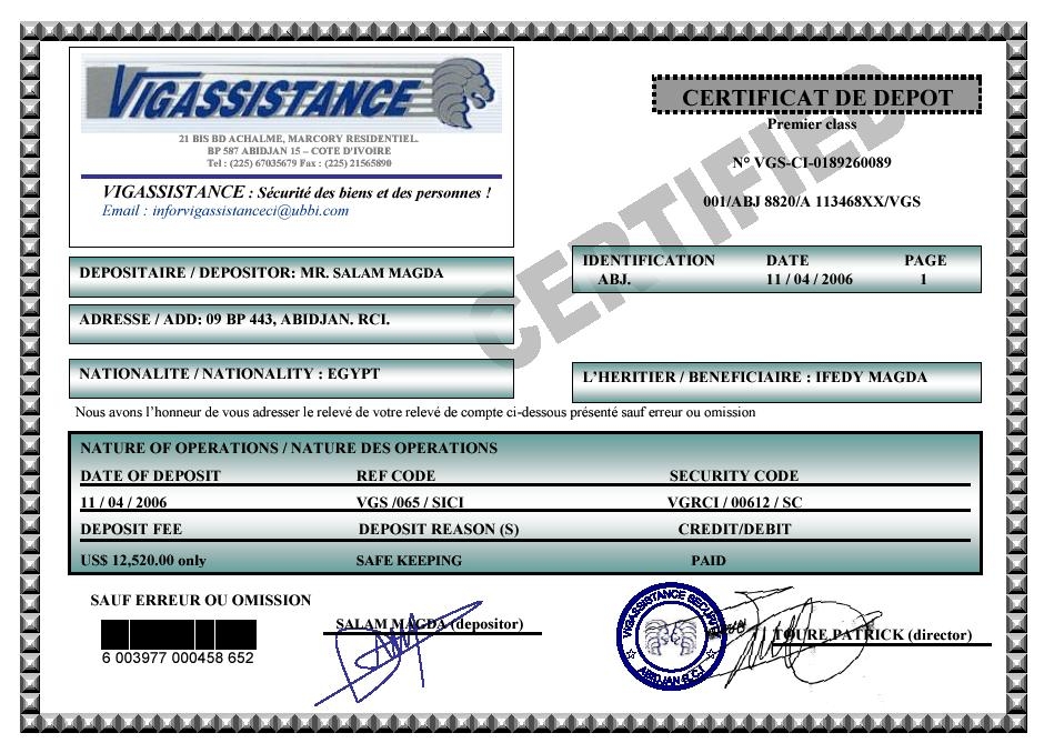 Dear Rev, l am just returning from the court now and it has been a very busy protocol for me. The affidavit of oath has been successfuly sworn into your name with all proceedures. Get in contact with the security company head office here, l have already submited a copy of this affidavit to them and they are expecting your direct contact to them for them to proceed with the release and delivery of the consignment to you asap. Please follow all their insruction for our success. Here is the contact information of the security company for you to you wish to reach them directly.