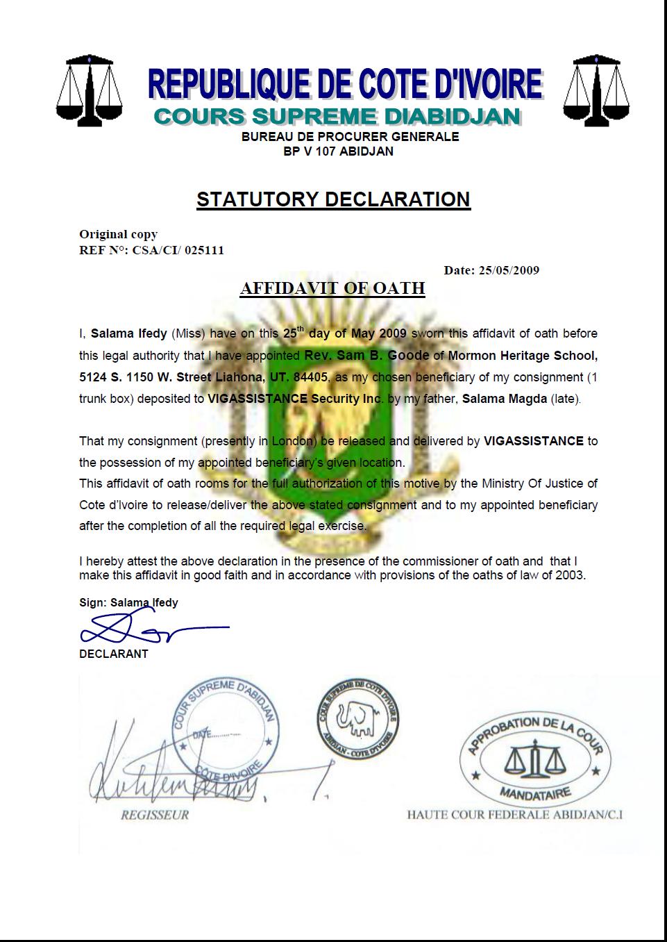 Dear Rev Sam, I am truly sorry for my late in response. It is because I dont have a personal computer, I use to communicate you from a cyber cafe in the basement of the guest house where I am staying now. Today I went to the security company where dad deposited the consignment before transfering it to London. The director gave me a written note to the court . I have submited the information (your name and address) and have edited the affidavit, they ask me to come back later in the day to have the endorsed copy from the Commissioner for oath. I will send you a copy and another copy to the security company when it is finally issued later today. Please Rev. I keep praying that we get to the success of this transaction as soon as possible. Wait to hear from me again soon. Ifedy |