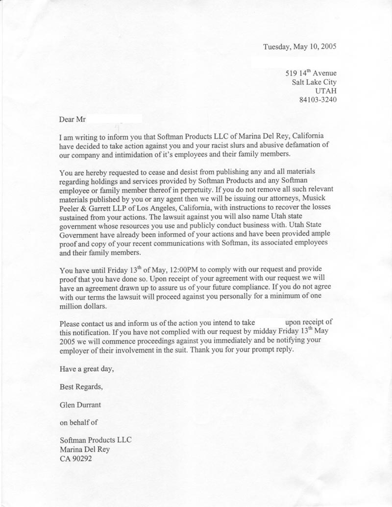 You are hereby requested to cease and desist from publishing any and all materials regarding holdings and services [I don’t know from holdings, but your service was great; I received the "product" practically overnight!] provided by Softman Products and any Softman employee or family member thereof in perpetuity. If you do not remove all such relevant materials published by you or any agent then we will be issuing our attorneys, Musick Peeler & Garrett LLP of Los Angeles, California, with instructions to recover the losses sustained from your actions. The lawsuit against you will also name [organization] whose resources you use and publicly conduct business with[*]. [Organization] have already been informed of your actions and have been provided ample proof and copy of your recent communications with Softman, its associated employees and their family members.