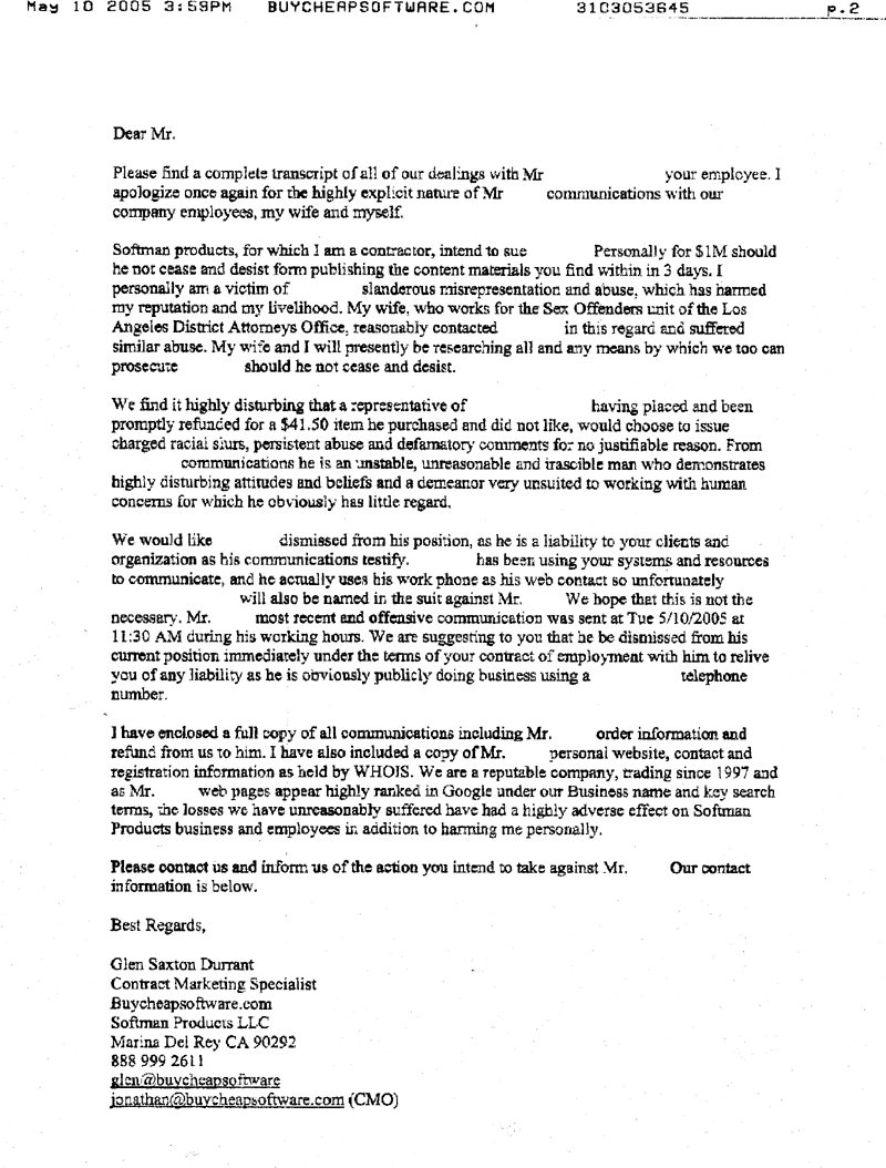 Softman products, for which I am a contractor, intend[s] to sue Mr. Personally for $1M should he not cease and desist form publishing the content materials you find within in 3 days, I personally am a victim of Mr. slanderous misrepresentation and abuse, which has harmed my reputation and my livelihood. My wife, who works for the Sex Offenders unit of the Los Angeles District Attorneys Office, reasonably contacted Mr. in this regard and suffered similar abuse. My wife and I will presently be researching all and any means by which we too can prosecute Mr. should he not cease and desist.